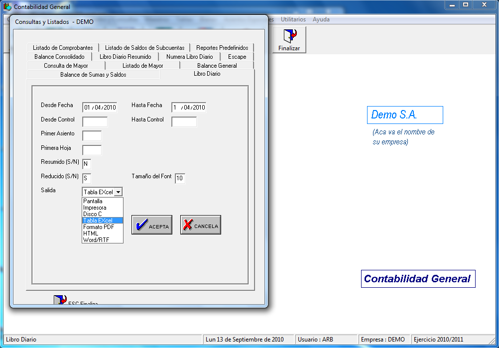 Todos los listados tienen salida a Editor de Pantalla, generación de archivo en Disco, Excel, Impresora, HTML, PDF, así como tienen posibilidad de parametrizar la salida por rango de fechas, cuentas, etc., de acuerdo al interes del listado.